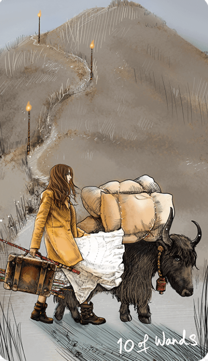 The 10 of Wands suggests that we may be moving with too large a burden and that this load may be unnecessary and holding us back from realizing our dreams. It asks us to reflect on our situation and lighten things up by prioritizing, accepting help, and letting go of outdated and potentially harmful patterns, behaviors, and relationships. It says that our burdens come in a variety of forms including material, spiritual, literal, emotional, and energetic and that if we are to arrive at the desired destination, we will need to unload.